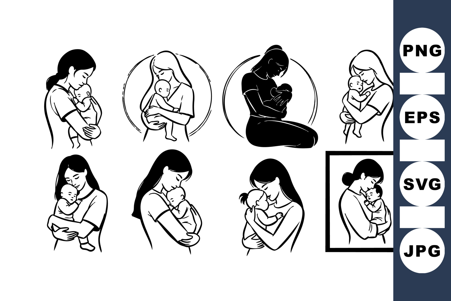 Black and white silhouette illustrations show mothers breastfeeding babies in multiple poses, including a framed portrait style, highlighting maternal care and bonding.