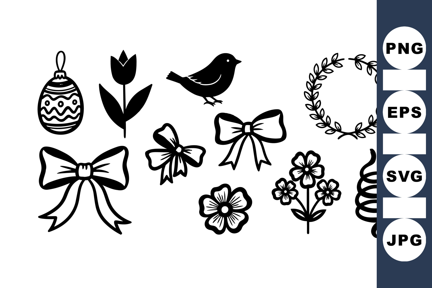 Collection of black silhouette line art icons featuring decorative bows, flowers, bird, wreath, and spring holiday motifs in minimalistic style, peaceful and elegant.
