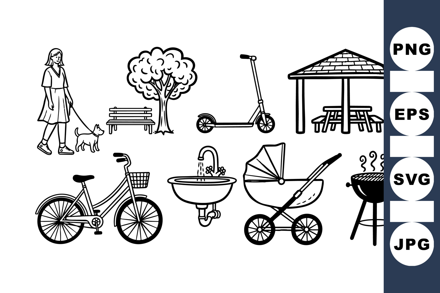 Baby Stroller Clipart Summer Leisure Bundle Bicycle And Scooter Outdoor Picnic Clipart Hand Drawn Park Family Picnic Set Urban Park Graphics Picnic Bbq Illustration Weekend Outing Design Park Activity Clipart