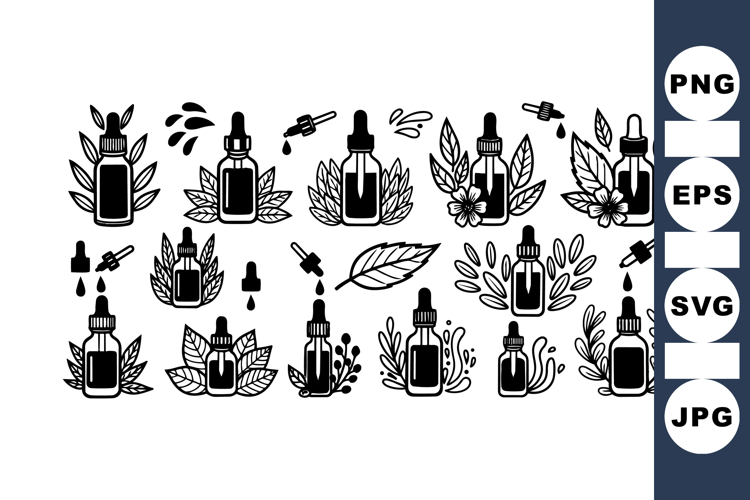 Essential Oil Clipart Black Silhouette Clipart Herbal Bottle Pack Natural Wellness Graphics Botanical Dropper Set Organic Skincare Illustrations Therapeutic Oil Bundle Aroma Therapy Design Health And Beauty Art Minimalist Plant Images