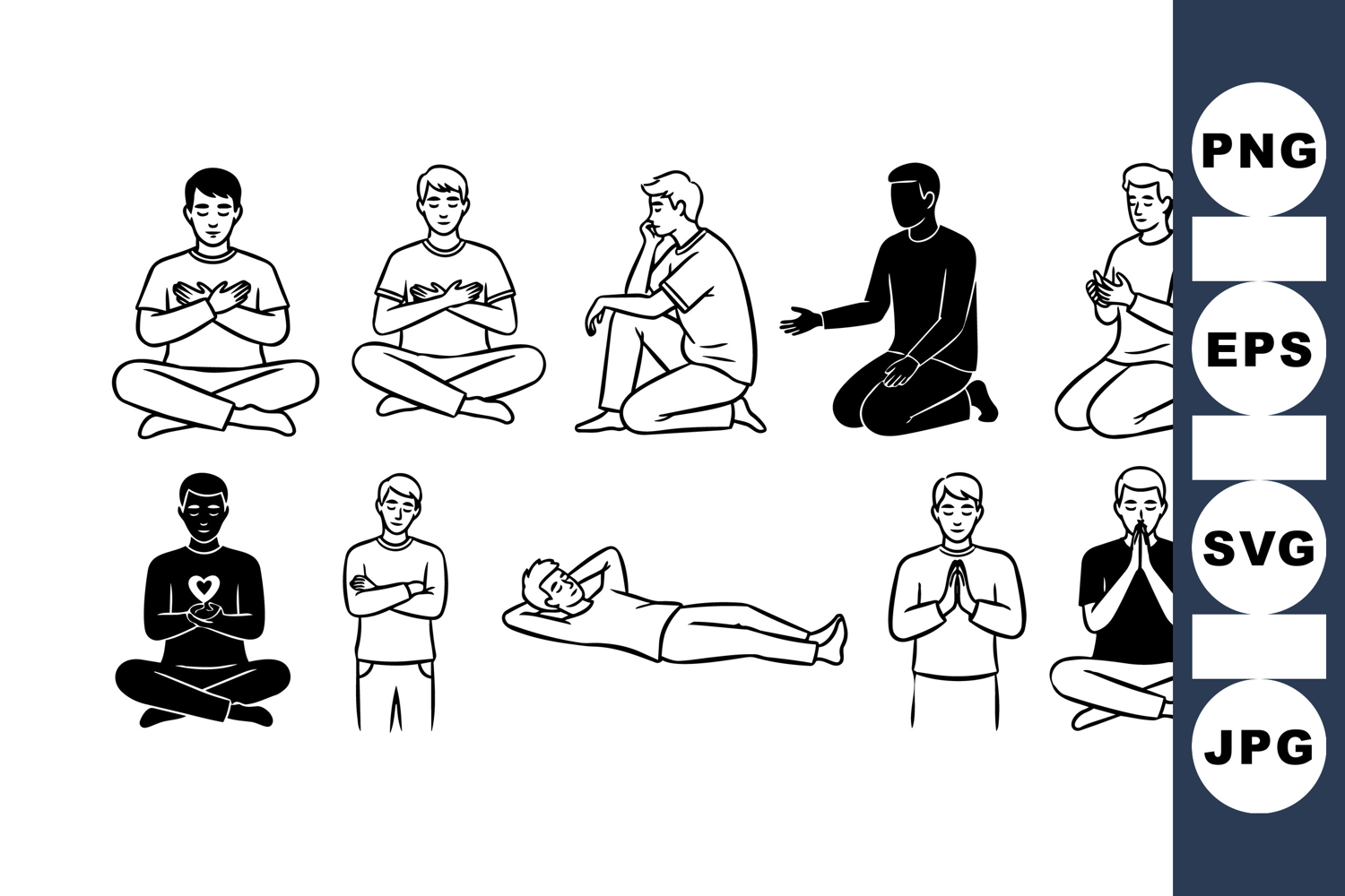 Relaxation Vector Pack Breathing Exercise Art Meditation Line Art Male Yoga Illustrations Seated Pose Bundle Lotus Position Clipart Mindfulness Sketch Set Yoga Posture Collection Calm Silhouette Graphics Spiritual Practice Kit