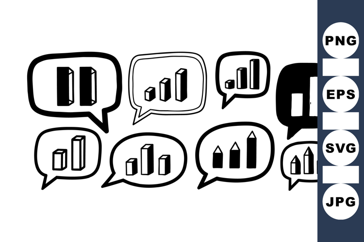 A hand drawn set of speech bubble icons illustrates bar chart and pencil motifs in black ink, suitable for web and print, playful.