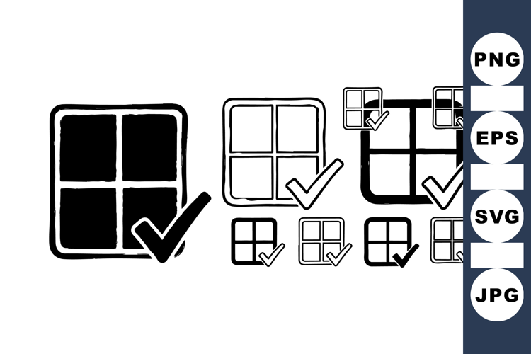 A hand drawn set of black and white checkmark icons featuring various square window shapes used for selection or approval in sketch style.
