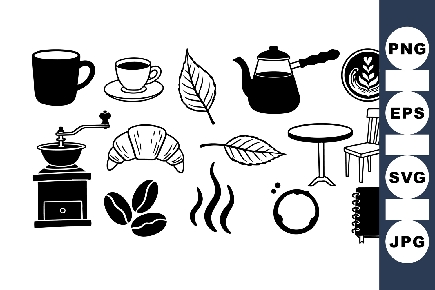 Black and white classic line art icons depict coffee cups, croissant, coffee grinder, kettle, leaves, steam, table, chair, and notebook in a minimalist style, peaceful mood.