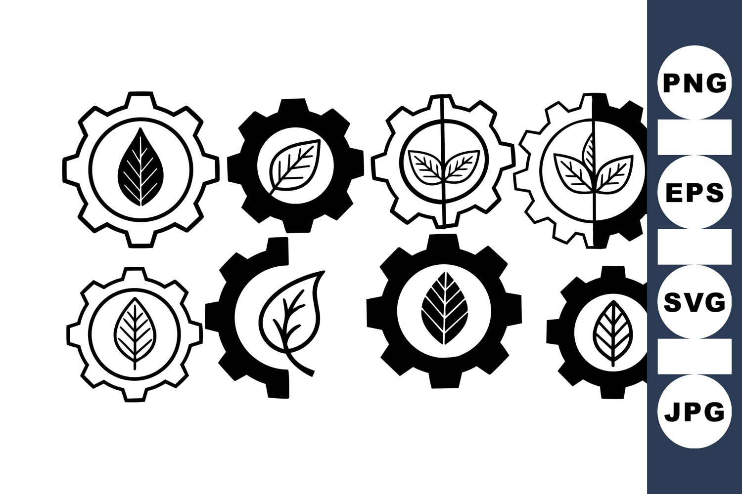 Monochrome vector set of gear icons combined with diverse leaf silhouettes, representing eco technology and sustainability themes in flat design style.