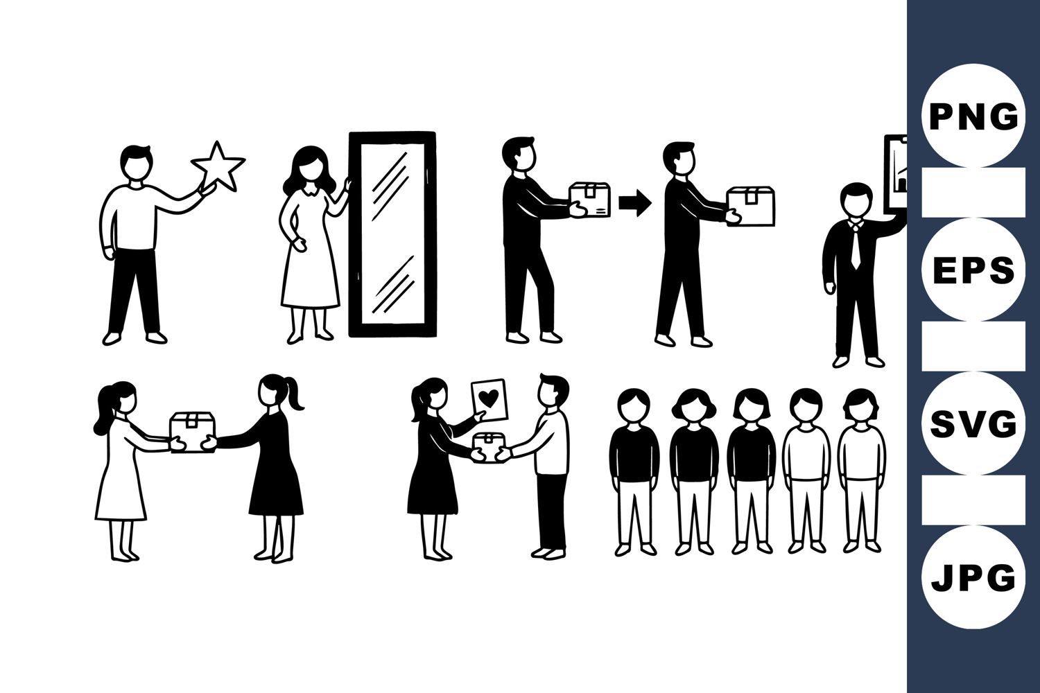 Monochrome vector line art showing multiple people handing over gifts, holding objects, and standing in sequence, suitable for diverse social and business context illustrations, clean and minimalistic.