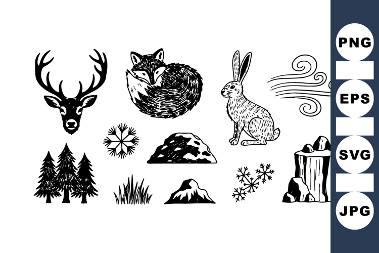 Rustic black and white woodland animals and nature scene silhouettes including stag head, curled fox, rabbit, pine trees, mountain, and snowflakes in vector artwork.