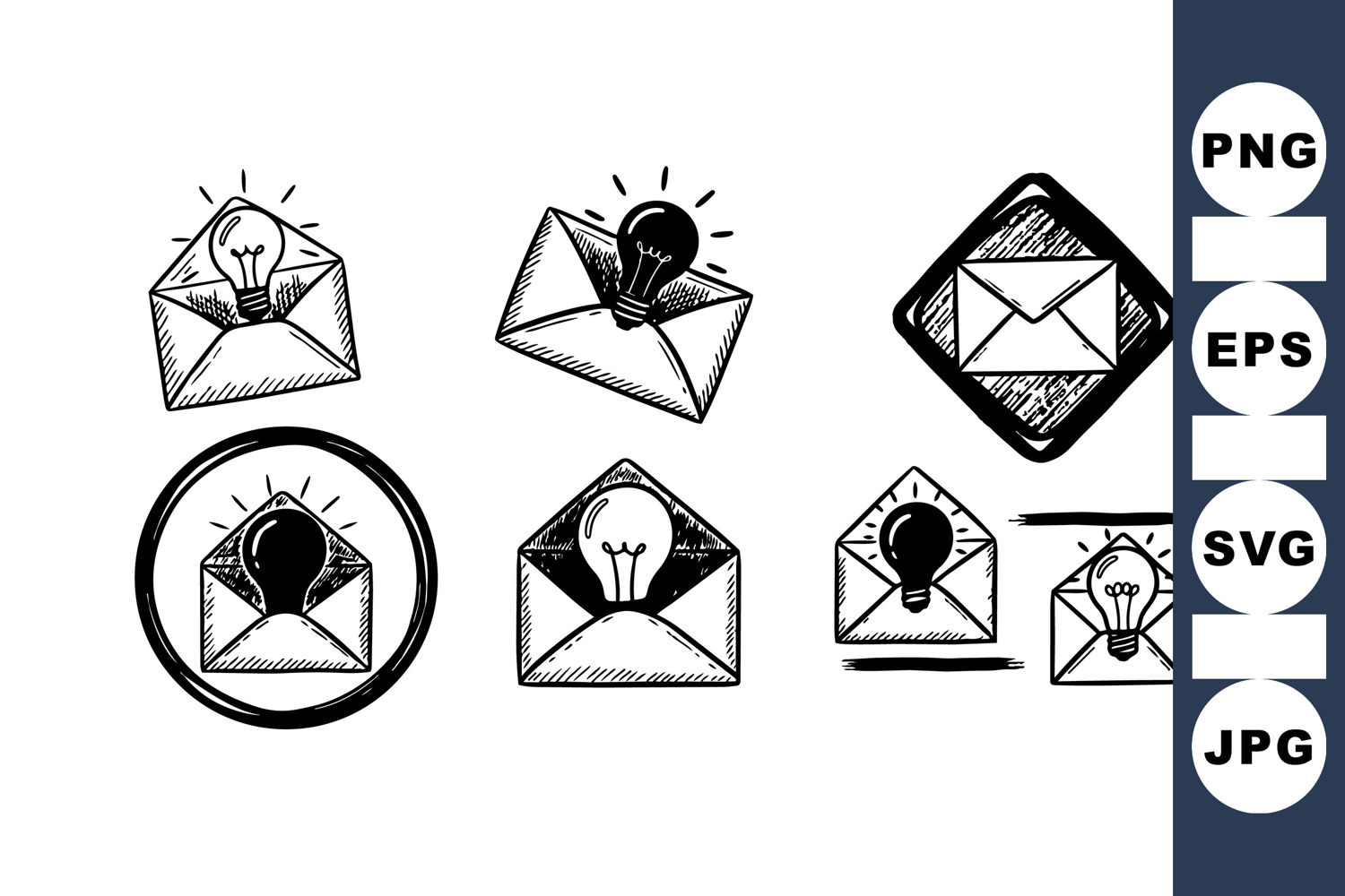 Black And White Icon Retro Mail Clipart Communication Symbol Set Email Message Design Vintage Envelope Icon Lightbulb Idea Graphic Lineart Envelope Bundle Sketch Lightbulb Drawing Letter Symbol Clipart Creative Mail Design