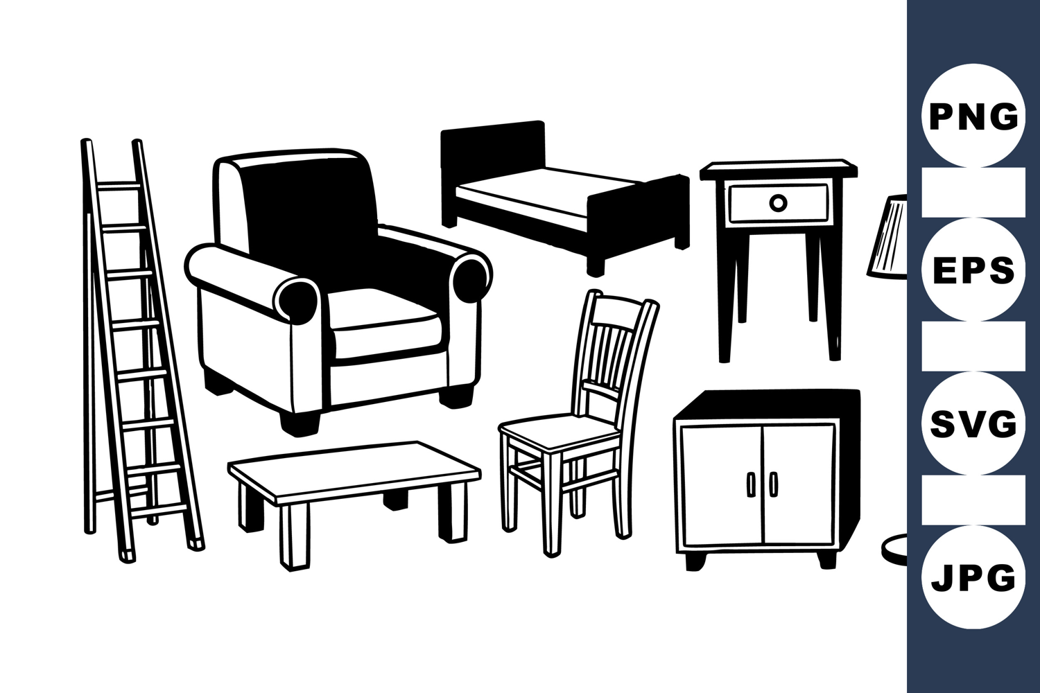 Simple black and white line drawing shows different furniture including ladder, armchair, bed, chair, table, cabinet, and floor lamp components in clear outline style.