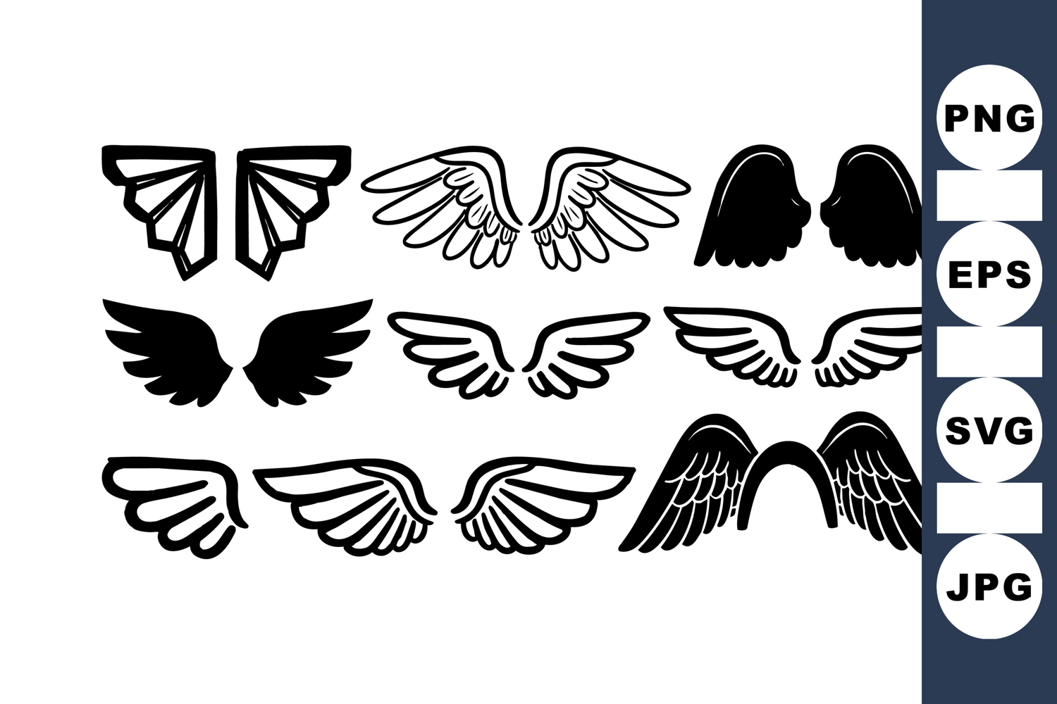 A set of black and white wing silhouettes in different shapes and styles displayed on a white background for graphic design use.