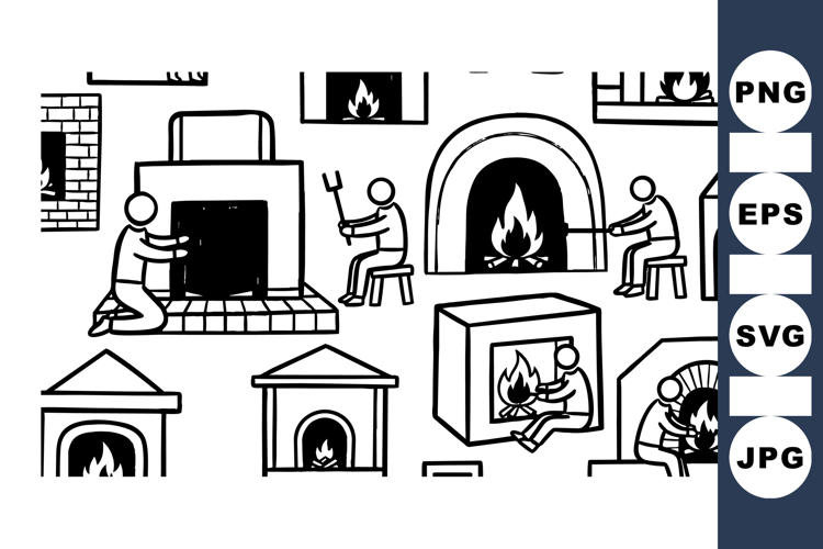 Black and white line art illustrating various people warming by and tending to fireplaces, creating a cozy and warm indoor atmosphere in a minimalist style.