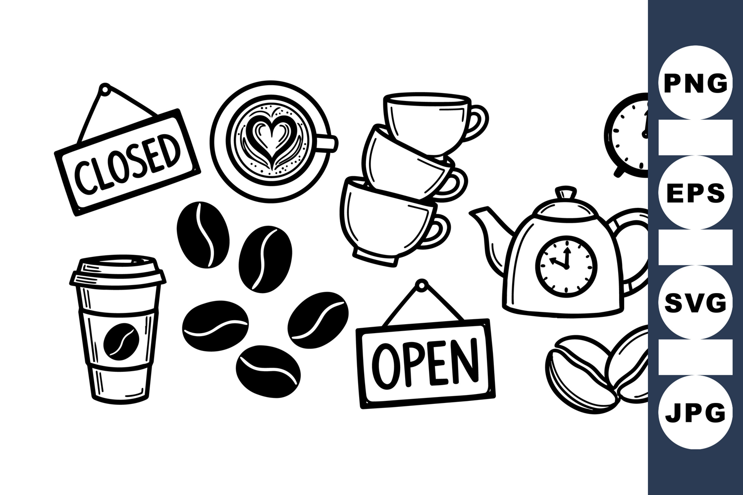 A black and white flat design set of coffee cups, beans, teapot, clock, and open closed signs in simple line art style, minimalist and clean.