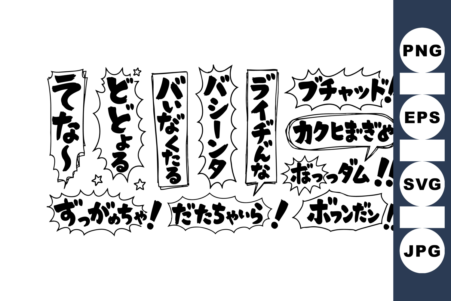 A collection of black and white japanese onomatopoeia sound effects in manga comic style featuring dynamic explosion shapes and diverse typography used for action scenes vibrant.