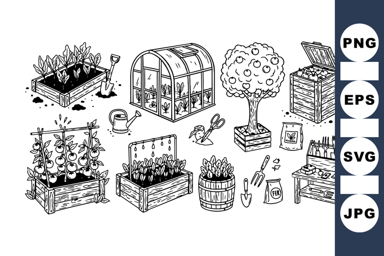 Detailed black and white line art showcases various gardening elements including greenhouse, compost bin, and plants, depicting sustainable outdoor gardening activities.