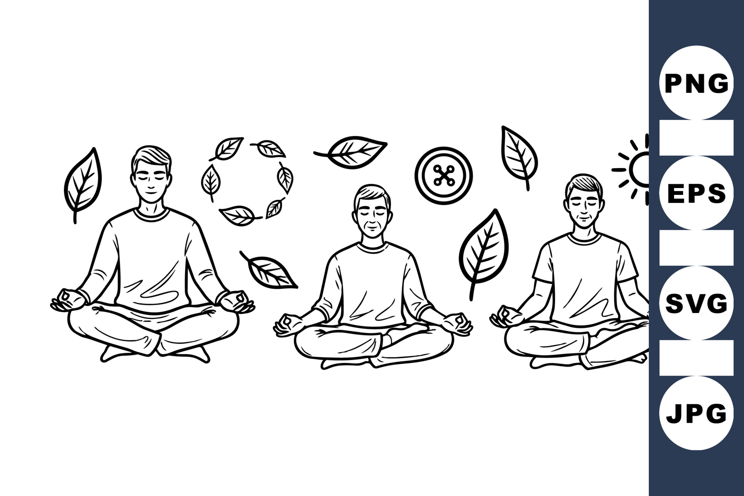 Line art illustration shows three men sitting in lotus meditation pose surrounded by floating leaves and nature inspired elements conveying peaceful mindfulness.
