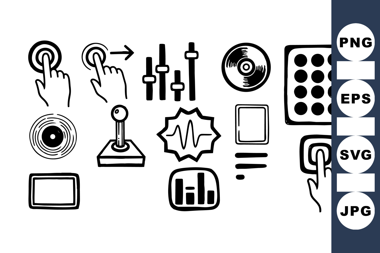 Monochrome vector set shows hand gestures pressing buttons, joystick, sliders, digital equalizer, and gaming controls in simple line art suitable for ui design and tech branding.