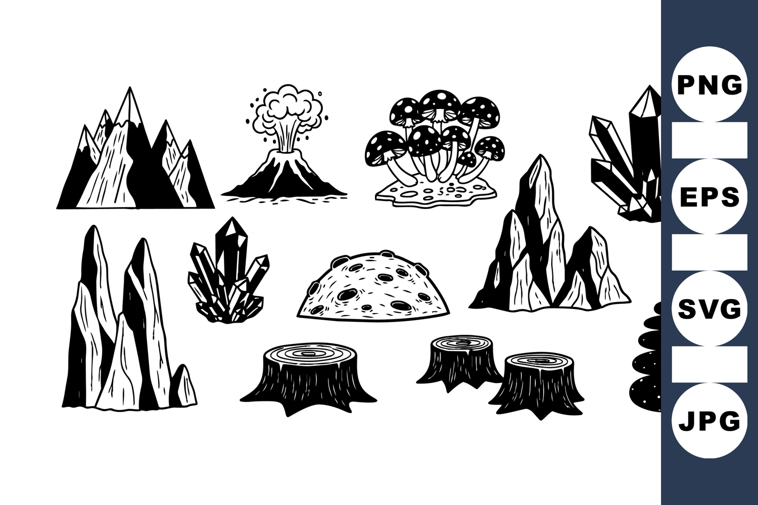 Hand Drawn Mountain Tree Stump Clipart Black And White Sketch Nature Clipart Set Crystal Cluster Art Volcano Illustration Pack Rock Formation Graphics Forest Landscape Bundle Wilderness Nature Set Outdoor Scenery Design