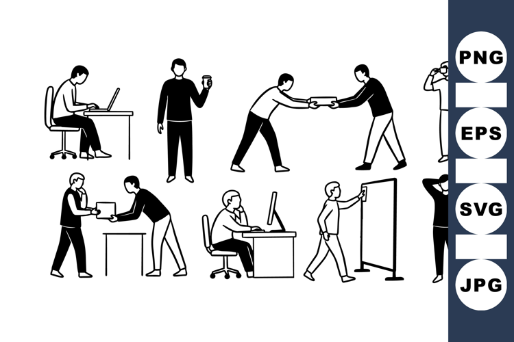 Monochrome line art shows diverse business people engaged in office tasks, presentations, and social interactions in a minimalistic style, conveying professional collaboration.