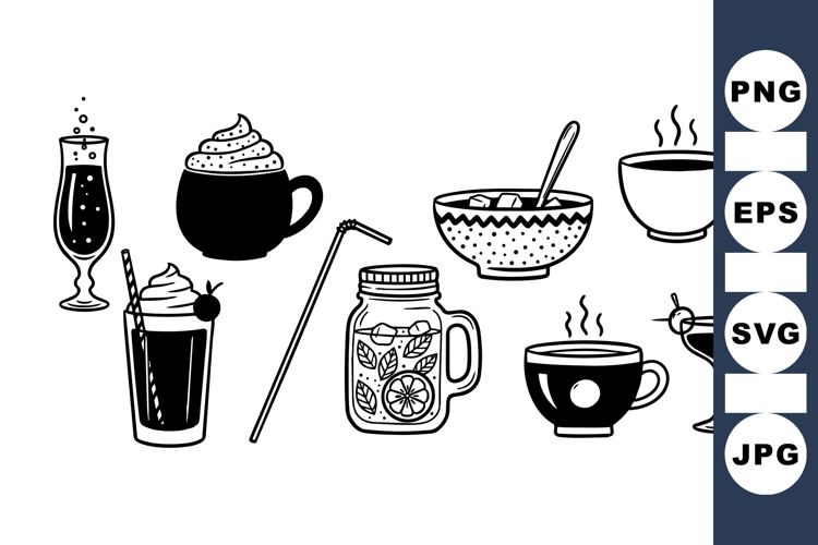 Minimalist black line art displays a variety of hot and cold beverages such as coffee, tea, cocktails, and smoothies in a clean illustration style.