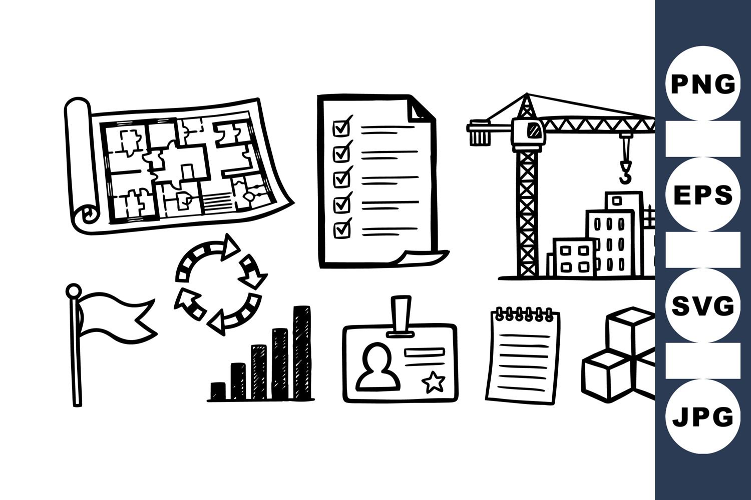 Construction Icon Project Planning Graphics Hand Drawn Blueprint Building Site Icons Architecture Drawing Pack Engineering Tool Construction Checklist Design Office Badge Clipart Crane Machine Illustration Recycle Symbol Collection