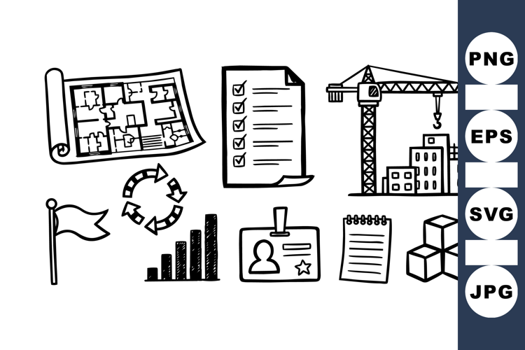 A collection of hand drawn construction and office icons including blueprint, checklist, crane, building, bar graph, flag, id card, paper, and cubes in black and white.