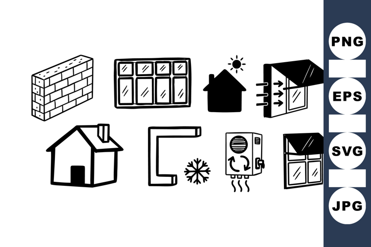 Collection of black and white icons depicts home related elements including walls, windows, heating, ventilation, and solar power in hand drawn style.