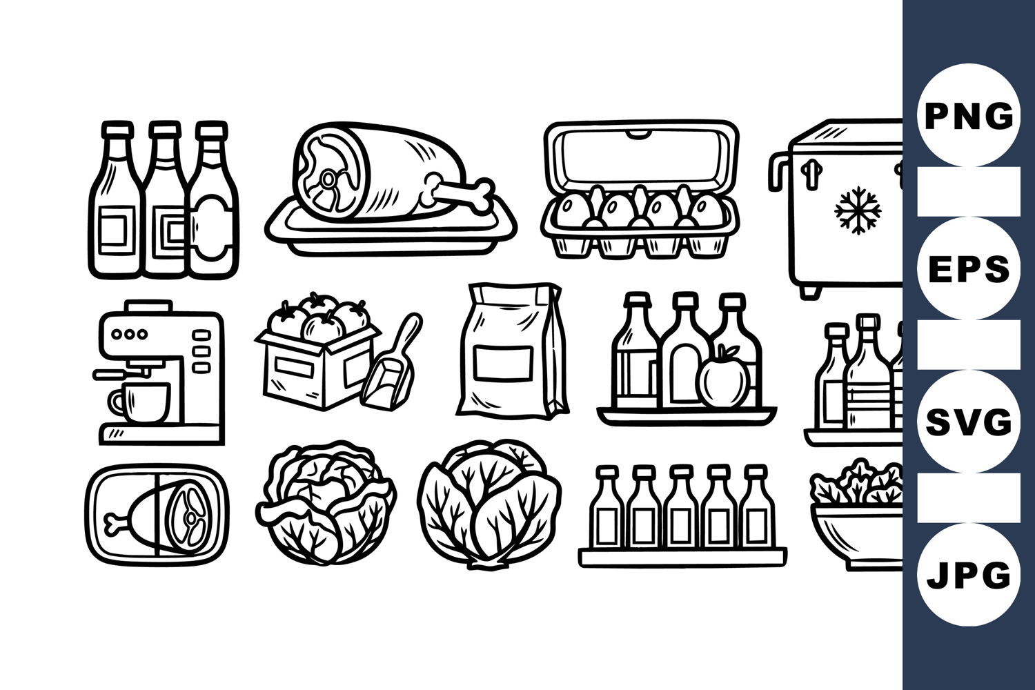 A detailed black and white line drawing illustrating various grocery food items such as bottled drinks, meat, eggs, fridge, cabbages, and kitchen essentials in tidy arrangement, simple artistic style.