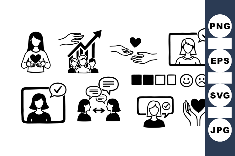 Black and white flat design icons depict businesswoman, teamwork, communication, customer feedback, and customer care in a minimalist style suitable for digital and print use