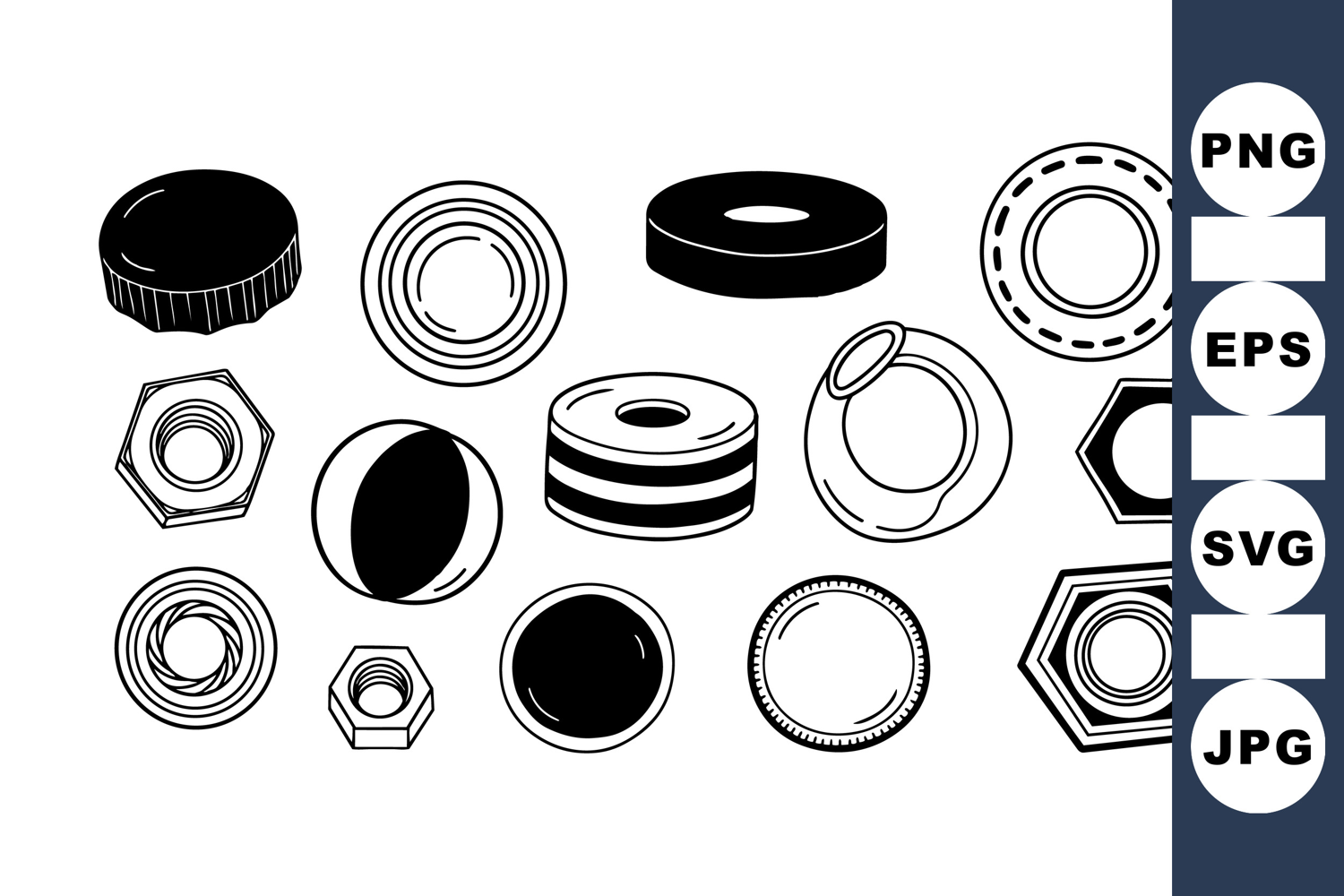 A flat design showcases black and white illustrations of nuts and washers with various shapes and sizes, ideal for industrial or educational uses, clean style.