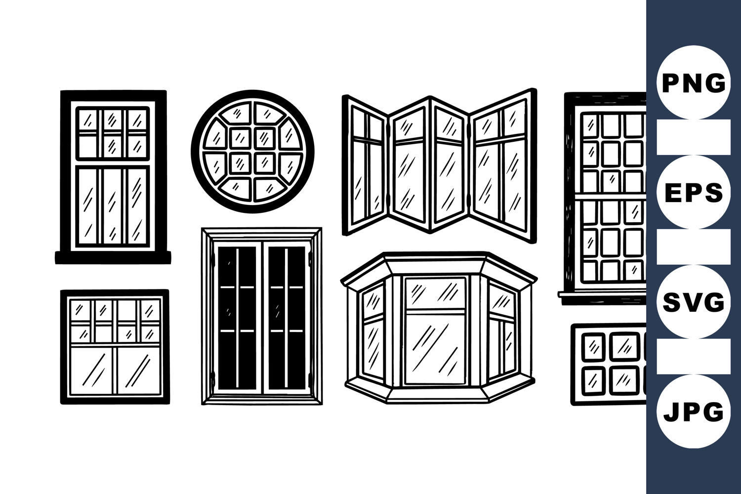 A detailed black and white vector illustration featuring diverse window designs with different frame shapes and pane patterns, showcasing architectural elements clearly.