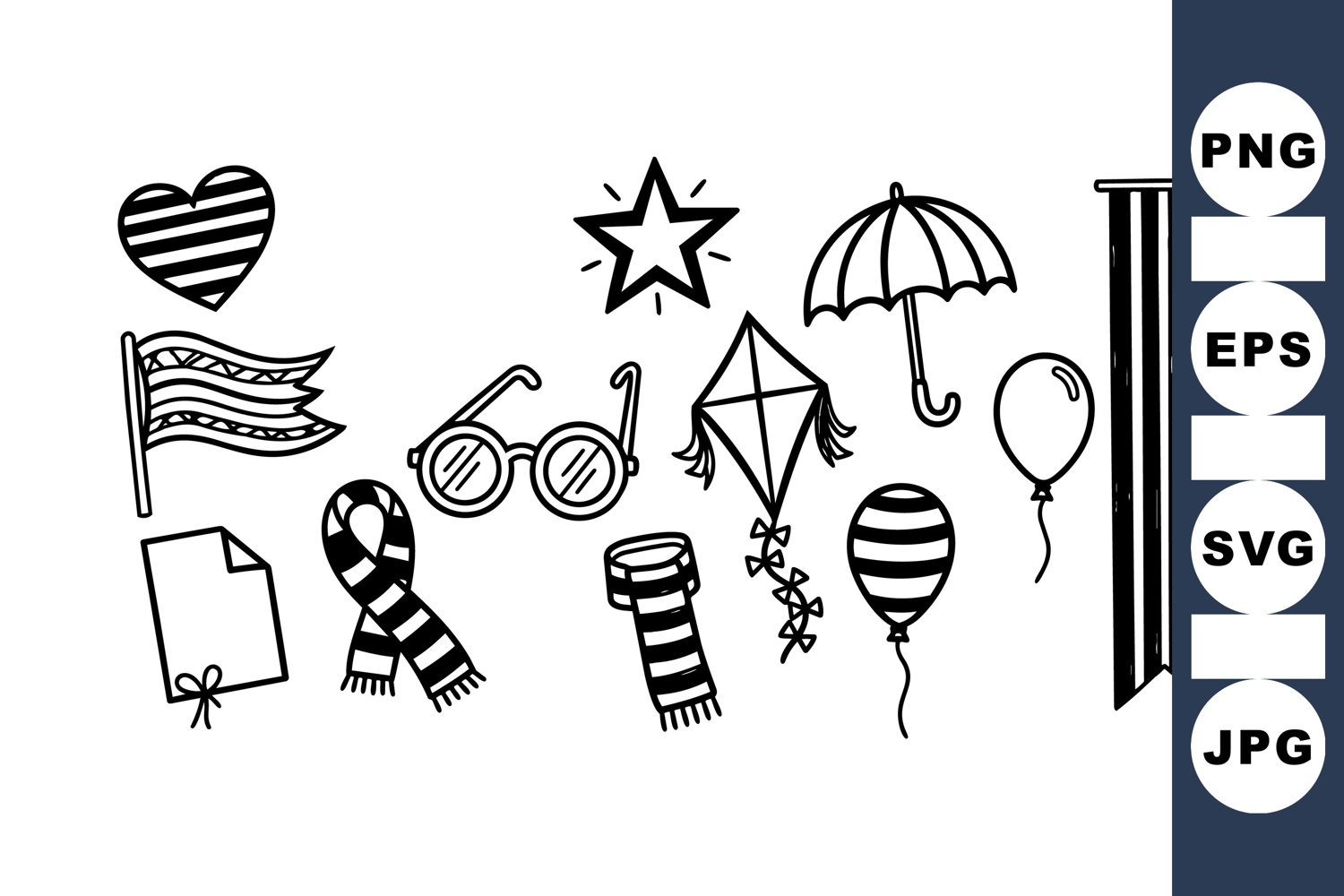 A of simple black and white hand drawn illustrations including patriotic symbols, balloon shapes, flying kite, flag stripes, and casual accessories in doodle style.