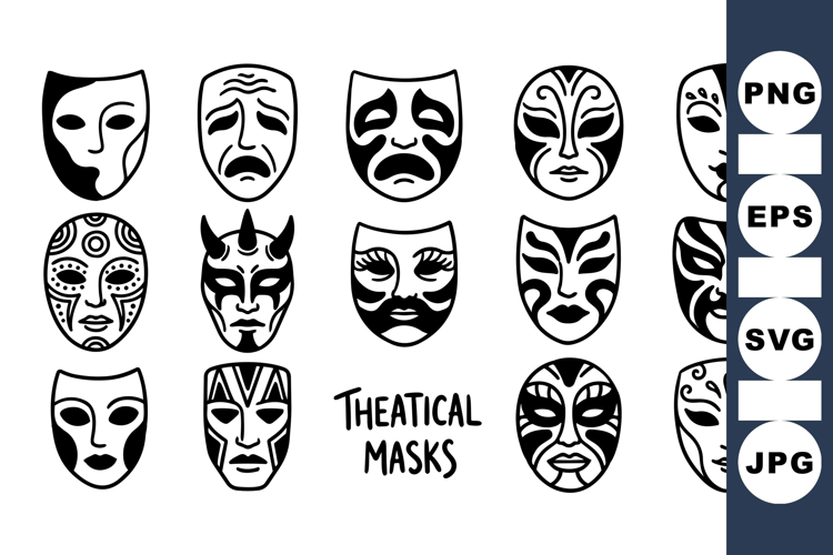 Theatrical Mask Dramatic Expression Clipart Black And White Masks Drama Masks Mask Design Pack Fiction Character Masks Festival Mask Collection Comic And Tragic Masks Performance Mask Graphics Costume Party Masks