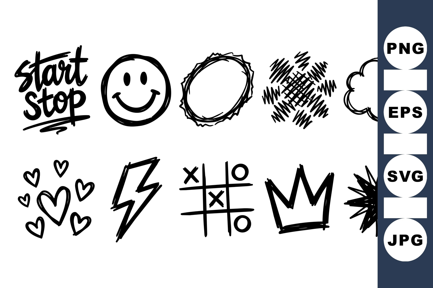 A diverse collection of hand sketched black ink icons featuring doodle style elements like hearts, lightning, smiling face, and stop start words, casual and playful mood