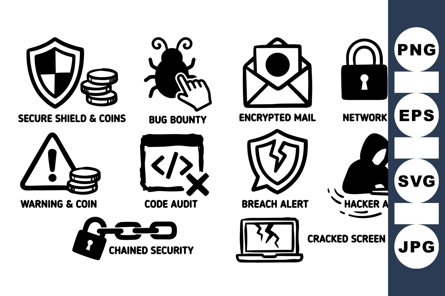 Cyber Security Icons Digital Security Pack Hacker Activity Clipart Network Lock Symbols Bug Bounty Graphics Secure Shield Icons Code Audit Illustrations Breach Alert Images Encrypted Mail Vector Chained Security Design