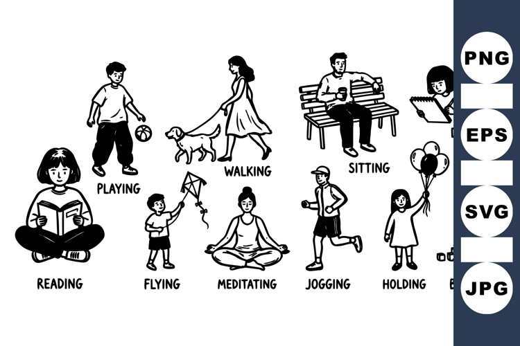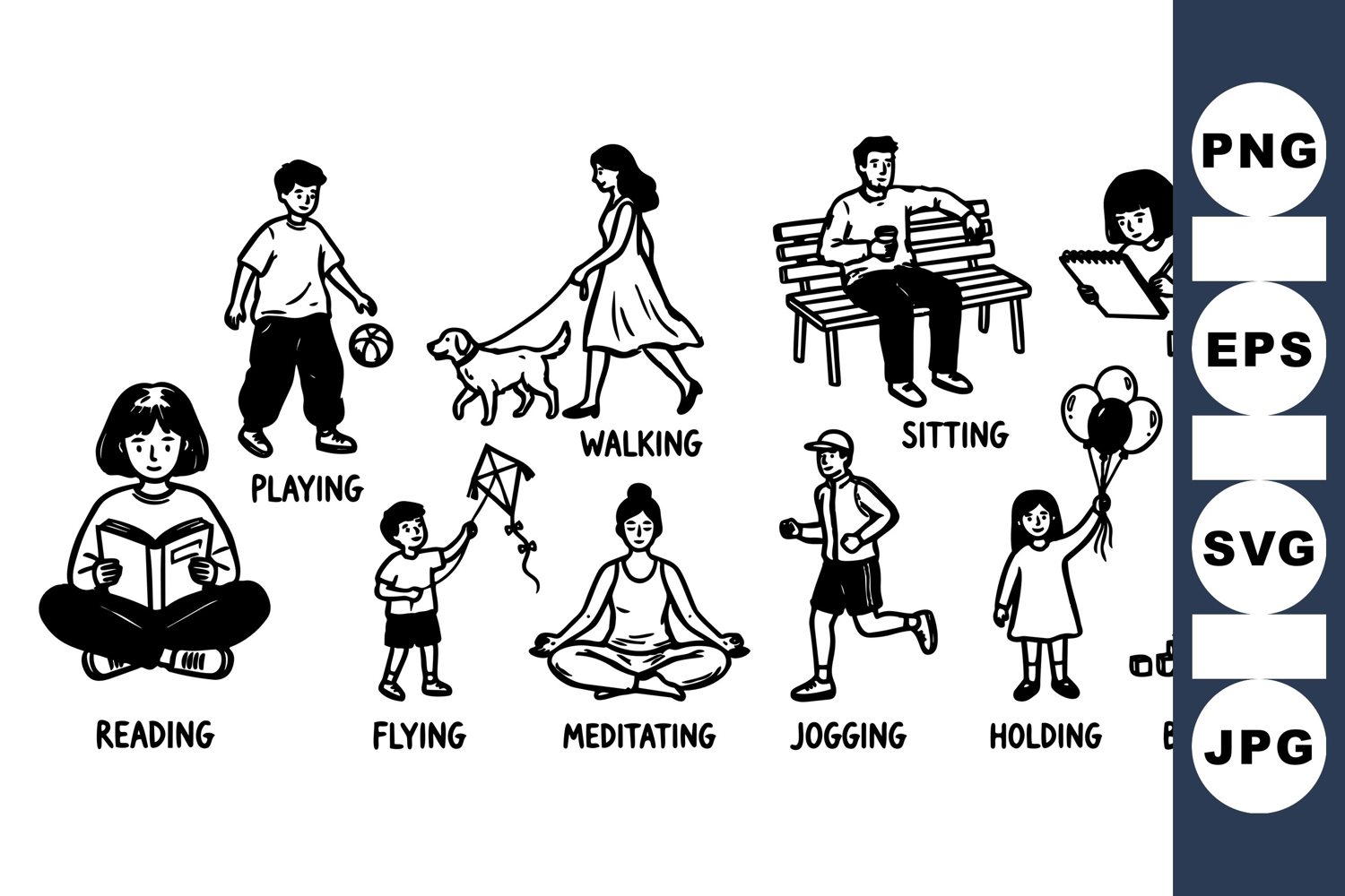 Simple black and white line art vector depicting children and adults engaging in various activities like playing, jogging, reading, walking dog, and meditating with clear labels.