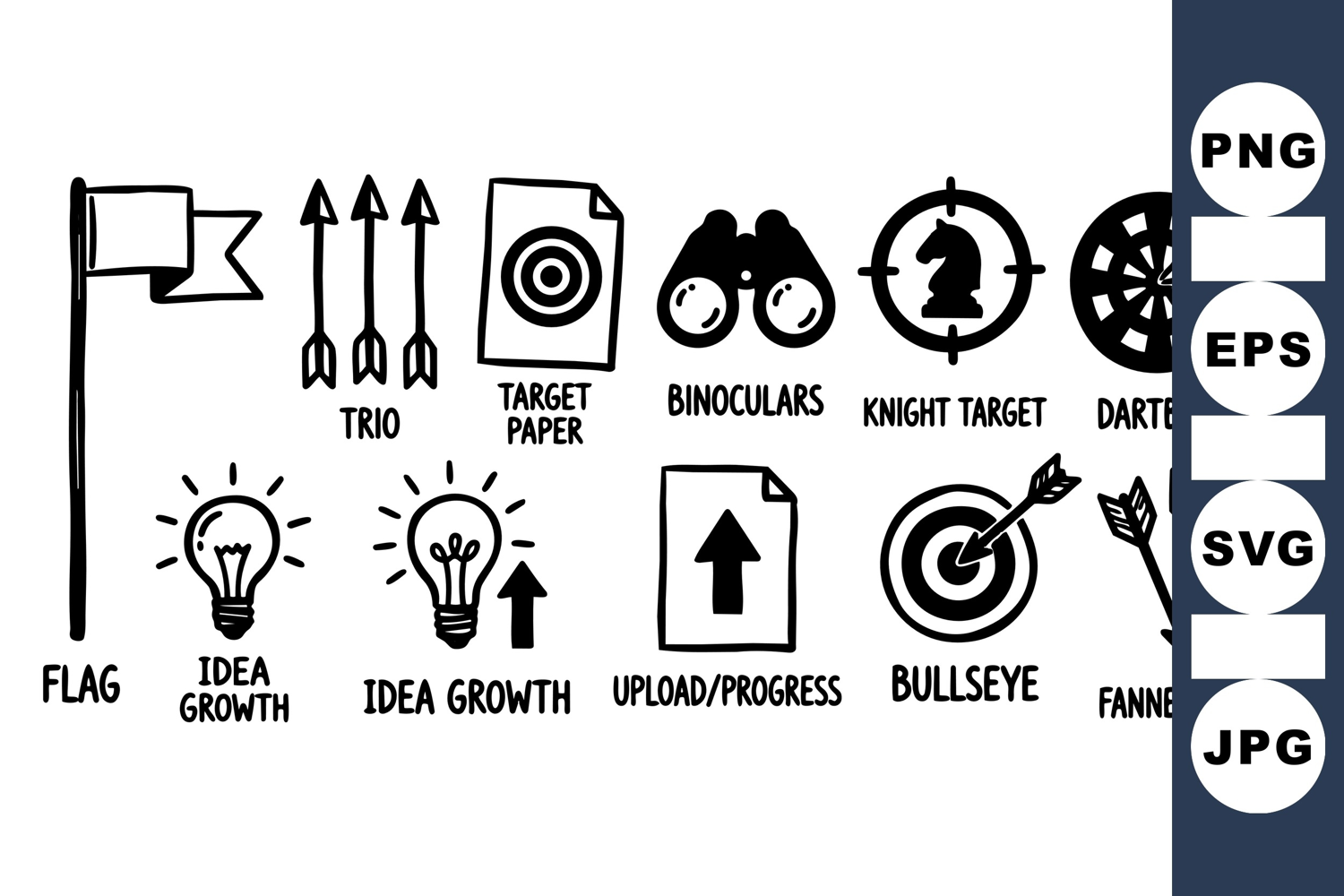 Black and white hand drawn icons include arrows, binoculars, flags, target signs, and lightbulb symbols representing growth and progress in sketch style.