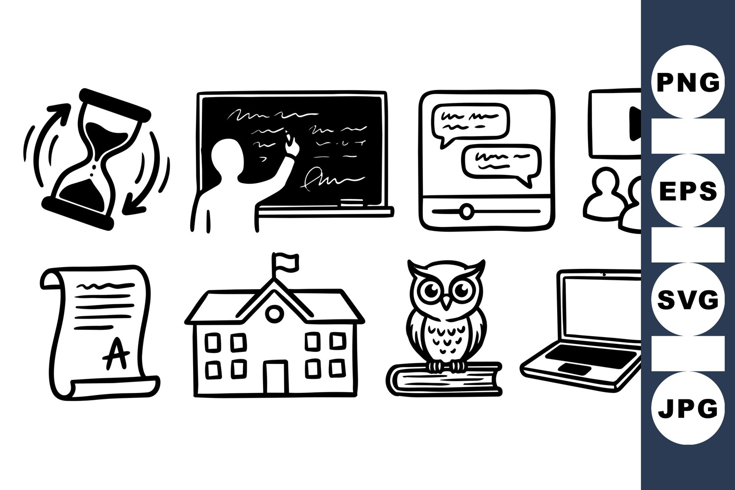 A collection of hand drawn education icons featuring a teacher at blackboard, hourglass, chat bubbles, laptop with ink quill, and owl on book in a simple line art style, suitable for learning and academic content with a clean monochrome look.