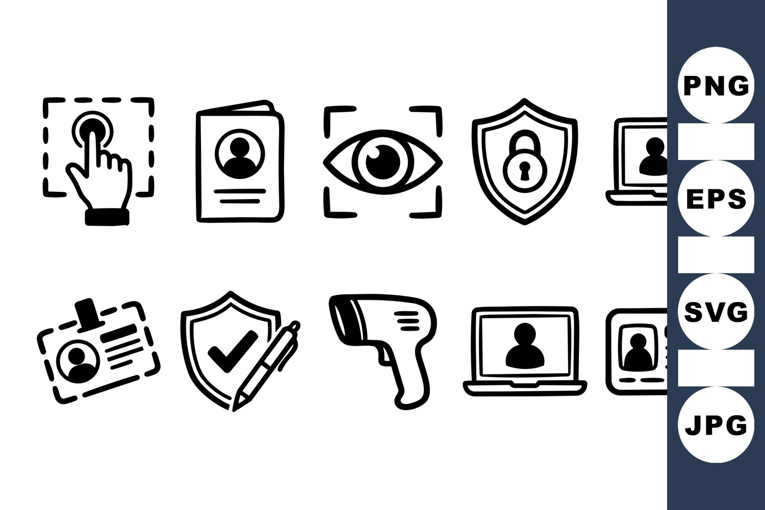 A collection of hand drawn security icons in black line style illustrating fingerprint, id, eye scan, shield lock, laptop access, badge, verification, and barcode scanner, minimal and clear.