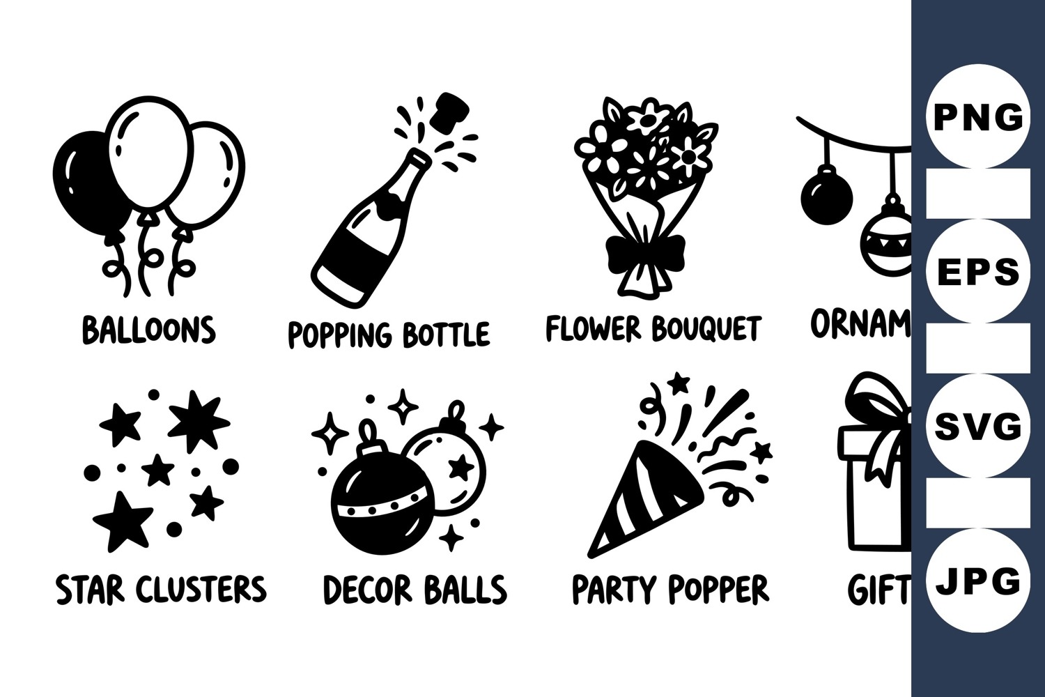 Monochrome vector icon showcasing party essentials like balloons, popping bottle, flower bouquet, ornaments, and gift box for celebration themes, minimalist style.