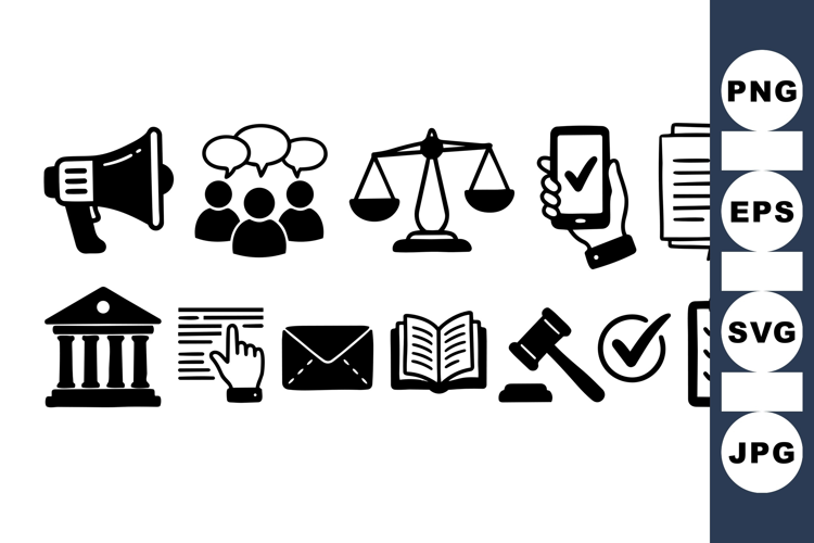 Black silhouette icons depict legal and communication concepts such as megaphone, speech bubbles, scales of justice, documents, and checklists in flat style, suitable for digital design and business contexts, neutral mood.