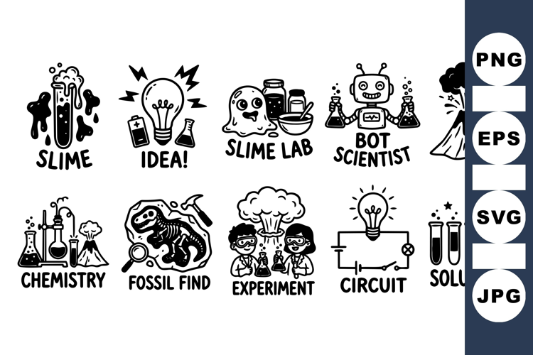 Collection of hand drawn black and white science icons featuring slime, fossils, experiments, circuits, and bot scientist, suitable for education or children’s projects with playful mood.