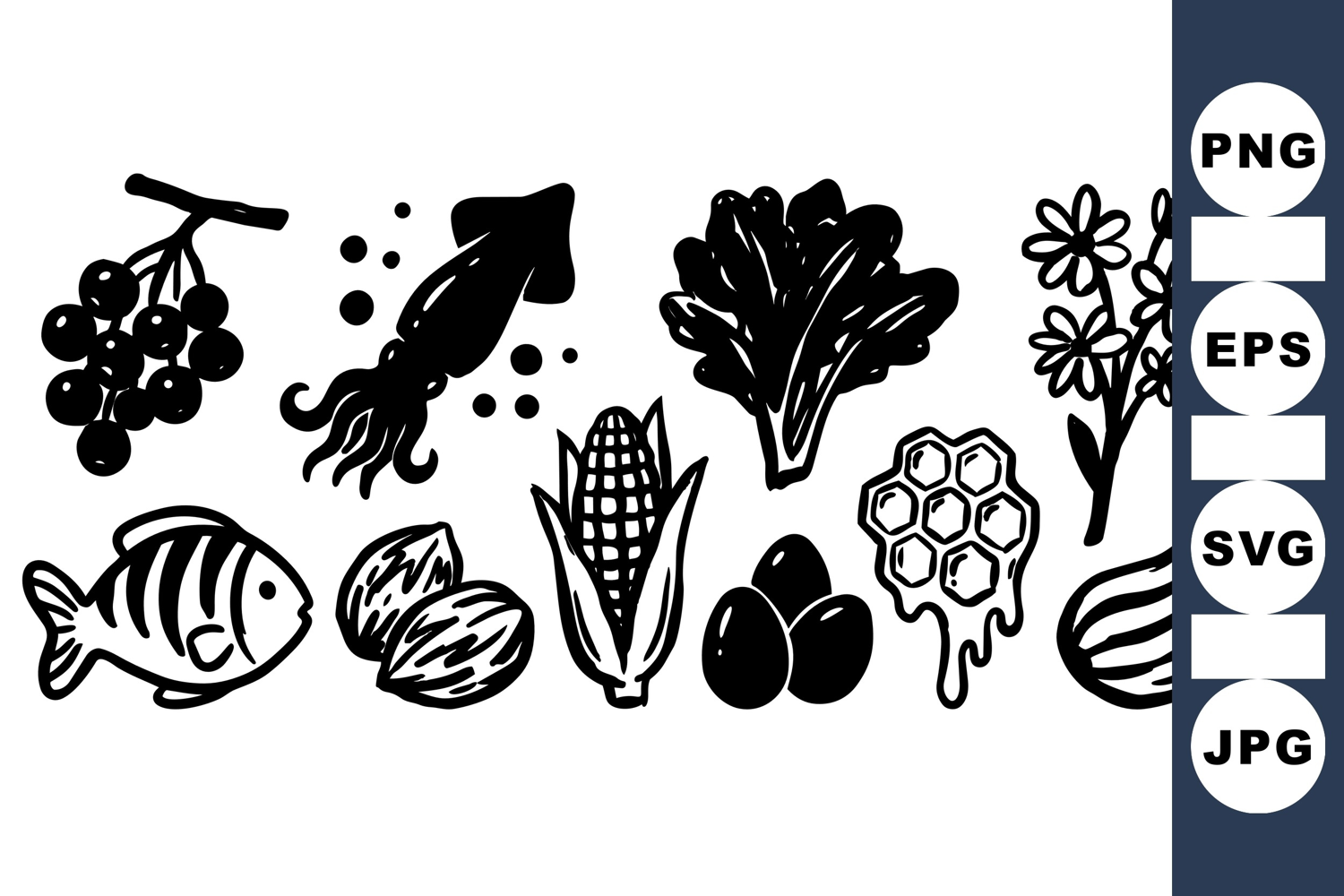 A collection of hand drawn black and white food illustrations including fish, corn, honeycomb, vegetables, flowers, and nuts in simple linear style, peaceful.