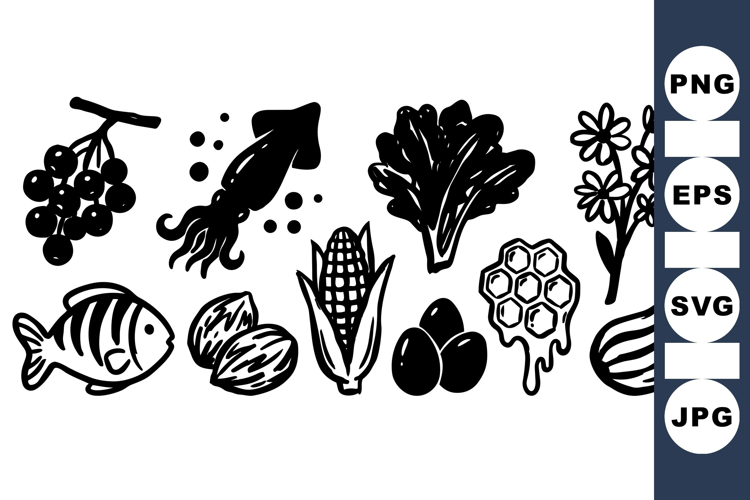 Hand Drawn Icons Food Vector Fruit And Vegetable Black And White Icons Organic Food Clipart Farm Fresh Graphics Rustic Food Illustrations Natural Sketch Vintage Food Icons Seafood Icon Pack