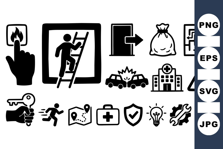 of flat design black vector emergency and safety icons with symbols for fire, exit, hospital, hazard, and key, suitable for signage and infographics, minimalistic style