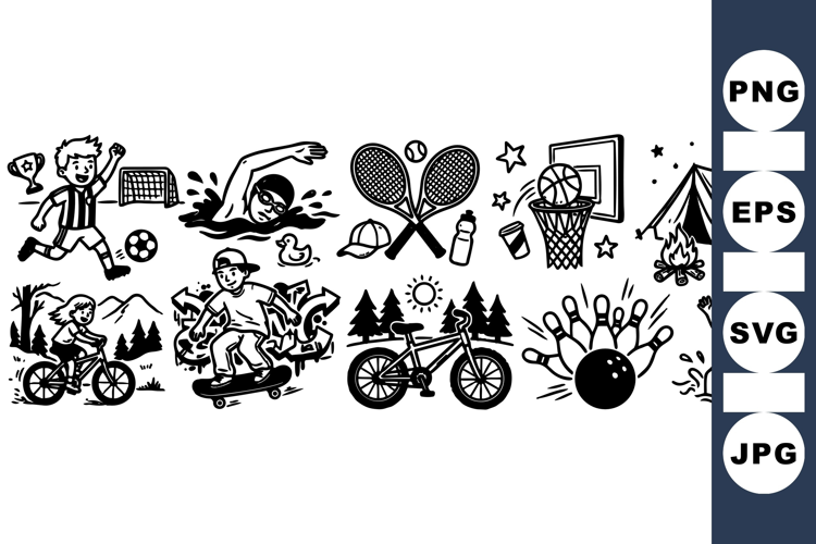 Bold black and white line art displays children engaging in soccer, swimming, cycling, skateboarding, camping, and bowling activities, creating a lively, playful, energetic mood.