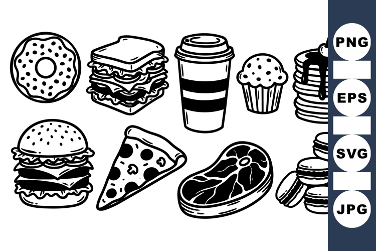 Simple black and white line art featuring various food icons including sandwich, burger, pizza, steak, and sweet treats for graphic design and menu illustration