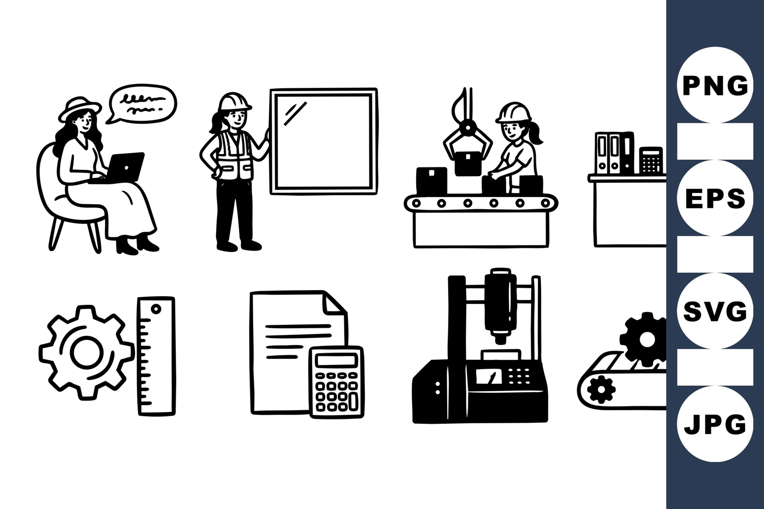 Office Worker Clipart Industrial Work Icons Engineering Tool Icons Factory Equipment Manufacturing Process Automation Machine Graphics Production Line Illustrations Assembly Line Drawings Quality Control Visuals Factory Workflow Designs