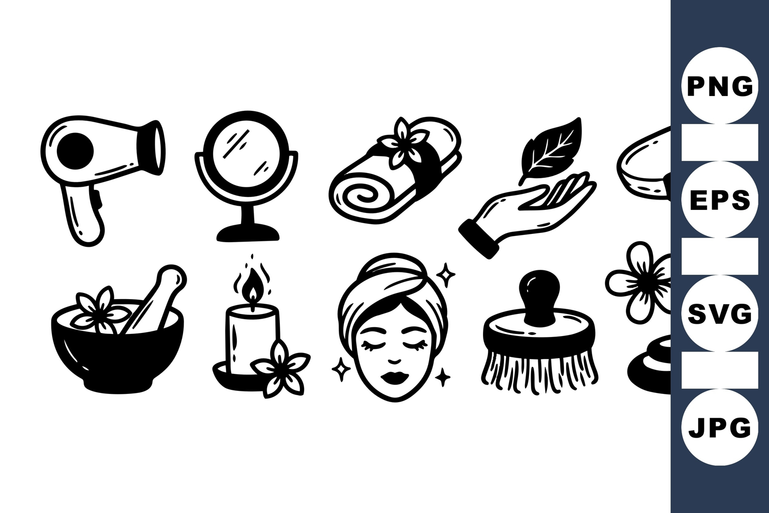 Collection of black and white spa and beauty icons featuring a hair dryer, towel, face with head wrap, brush, candle, and floral elements for wellness branding and print projects in minimalist vector style.