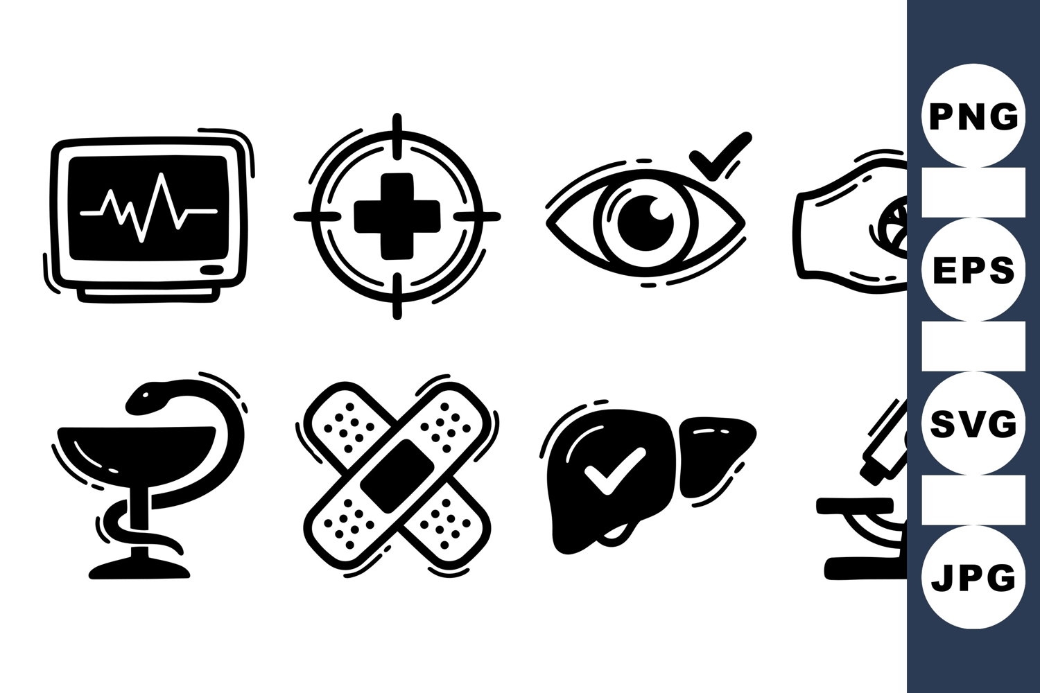 A collection of hand drawn healthcare icons includes vital signs monitor, medical cross, eye examination, blood testing, medicine snake bowl, bandages, liver health, and microscope for lab work.