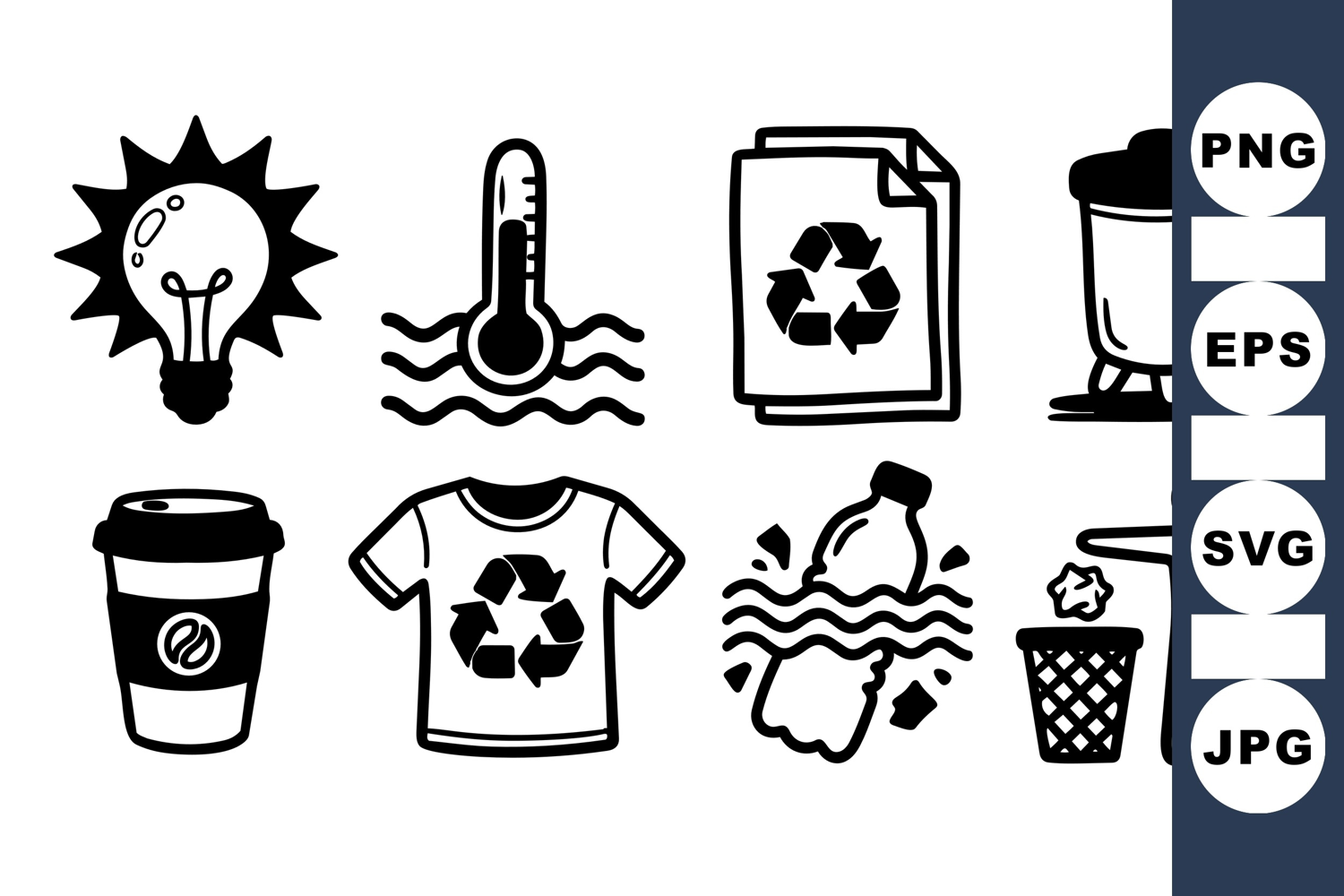 A of black and white vector icons showing energy conservation, temperature measurement, recycling on a shirt and paper, plastic pollution, and waste management in minimalist style.